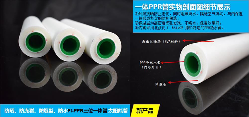 新型PPR保溫管采用恒節PPR熱水內芯管+聚氨酯發泡保溫層+PVC(PE) 外套保護層,三層緊密閉合,中間無縫隙。無空氣層